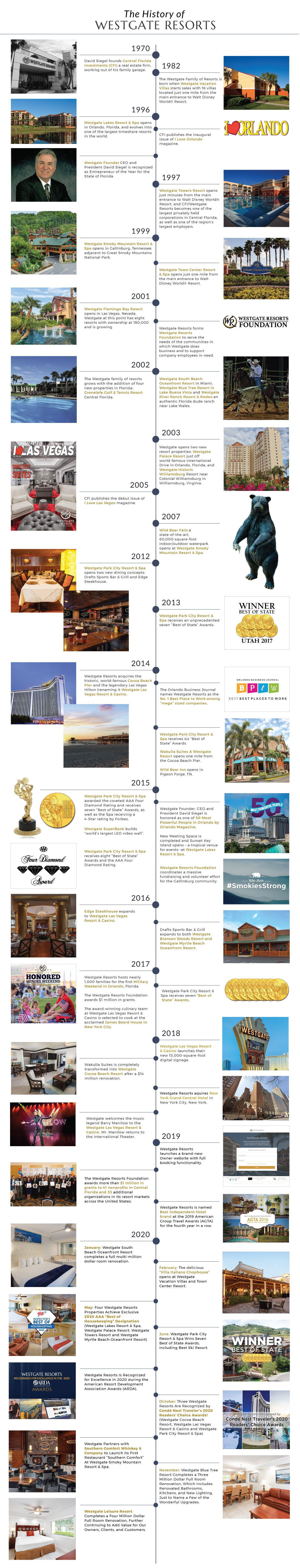 Desde un pequeño campo de naranjos y el sueño de un hombre que trabaja en su garaje, Westgate Resorts y su empresa matriz, Central Florida Investments (CFI), se han convertido en el la empresa de tiempo compartido de propiedad privada más grande del mundo , empleando a más de 10,000 en los Estados Unidos. La compañía se ha expandido desde sus complejos turísticos originales en Florida Central para incluir complejos turísticos en Miami Beach, Florida; Daytona Beach, Florida; Park City, Utah; Gatlinburg, Tennessee; Las Vegas, Nevada; Williamsburg, Virginia; Branson, Misuri; Tunica, Mississippi; y Myrtle Beach, Carolina del Sur.